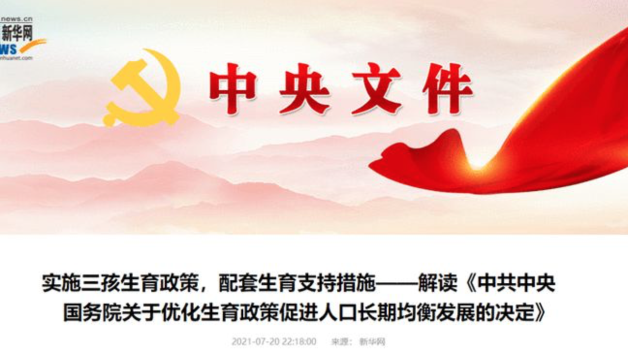 7月20日晚間,《中共中央 國務院關于優(yōu)化生育政策 促進人口長期均衡發(fā)展的決定》正式公布,文件就促進人口長期均衡發(fā)展,優(yōu)化生育政策,實施一對夫妻可以生育三個子女政策。