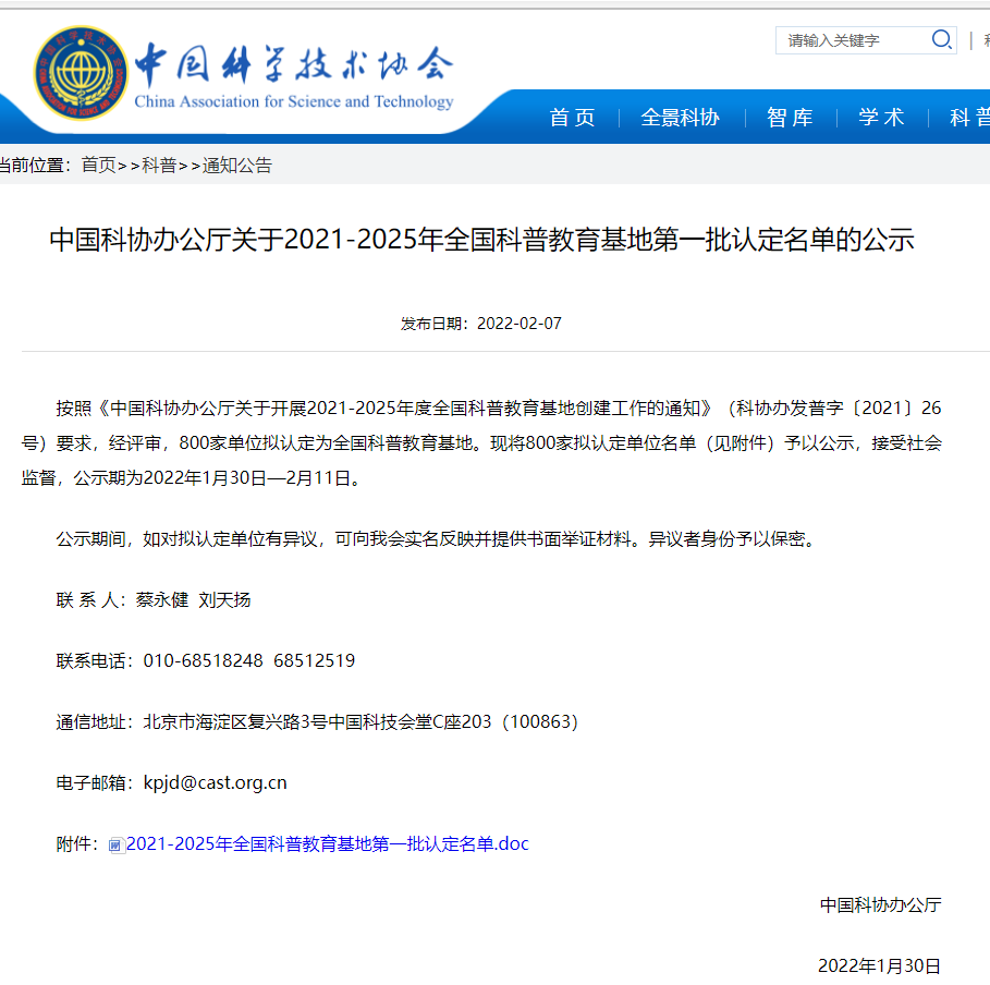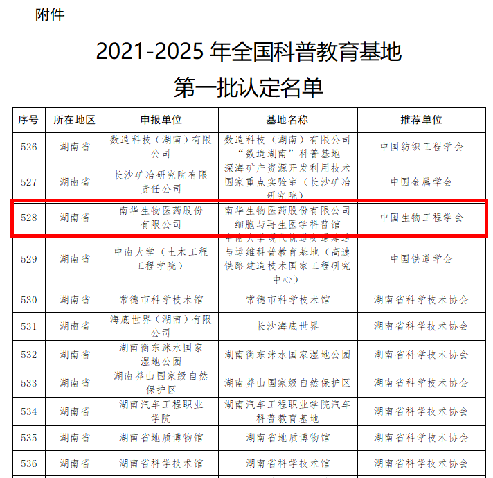 (中國(guó)科學(xué)技術(shù)協(xié)會(huì)官方發(fā)布2021-2025年全國(guó)科普教育基地名單部分截圖,南華生物細(xì)胞與再生醫(yī)學(xué)科普館位列其中。)