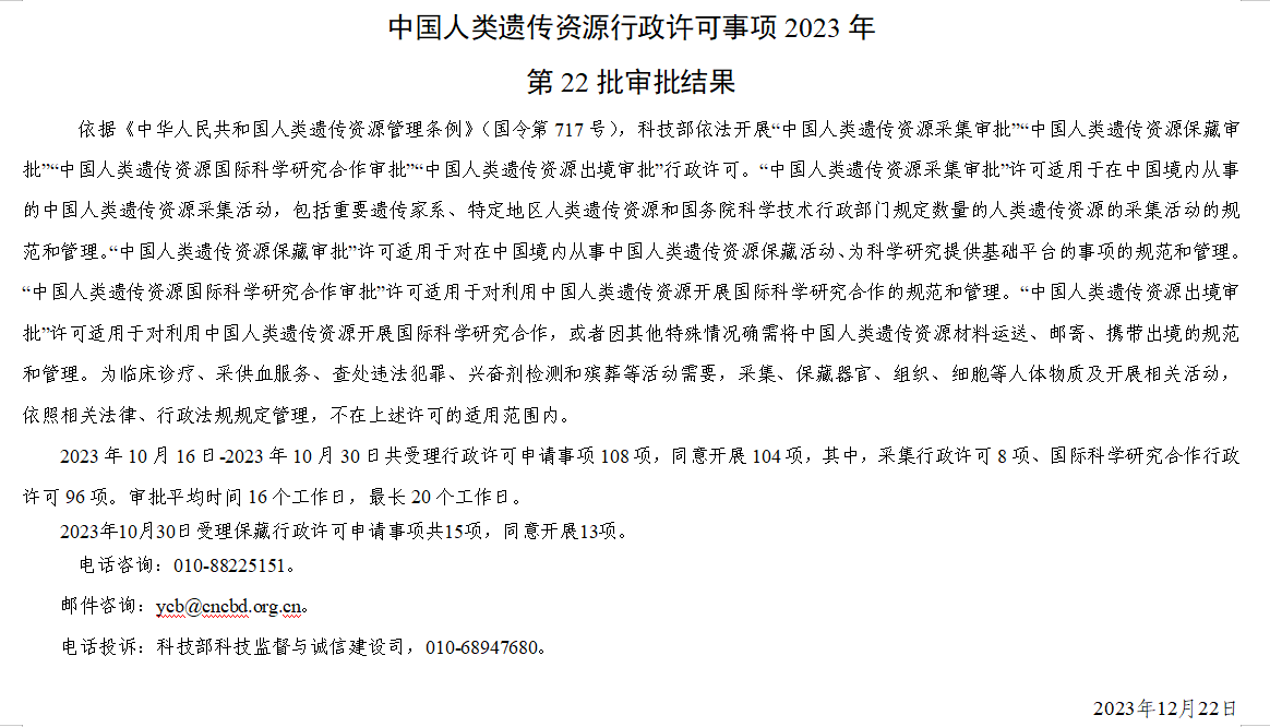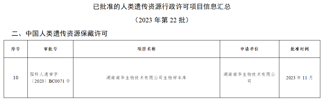 2023年12月29日,國家科技部公示了中國人類遺傳資源審批事項2023年第22批結(jié)果,南華生物醫(yī)藥股份有限公司(股票代碼:000504)子公司湖南南華生物技術(shù)有限公司生物樣本庫順利通過科技部人類遺傳資源保藏審批(國科人遺審字〔2023〕BC0071號)。