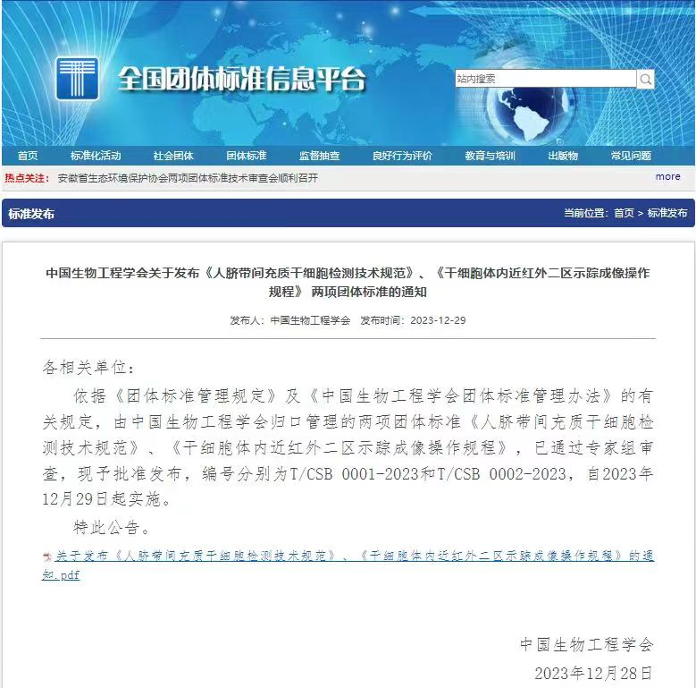 南華生物子公司湖南南華生物技術(shù)有限公司聯(lián)合復(fù)旦大學(xué)附屬華山醫(yī)院、上海交通大學(xué)醫(yī)學(xué)院及附屬醫(yī)院、中國科學(xué)院上海技術(shù)物理研究所和中南大學(xué)湘雅二醫(yī)院共同編撰的“干細胞體內(nèi)近紅外二區(qū)示蹤成像操作規(guī)程”團隊標準(標準編號:T/CSB 0002—2023),日前已通過中國生物工程學(xué)會審定,并于2023年12月28日在全國團體標準信息平臺正式發(fā)布 。