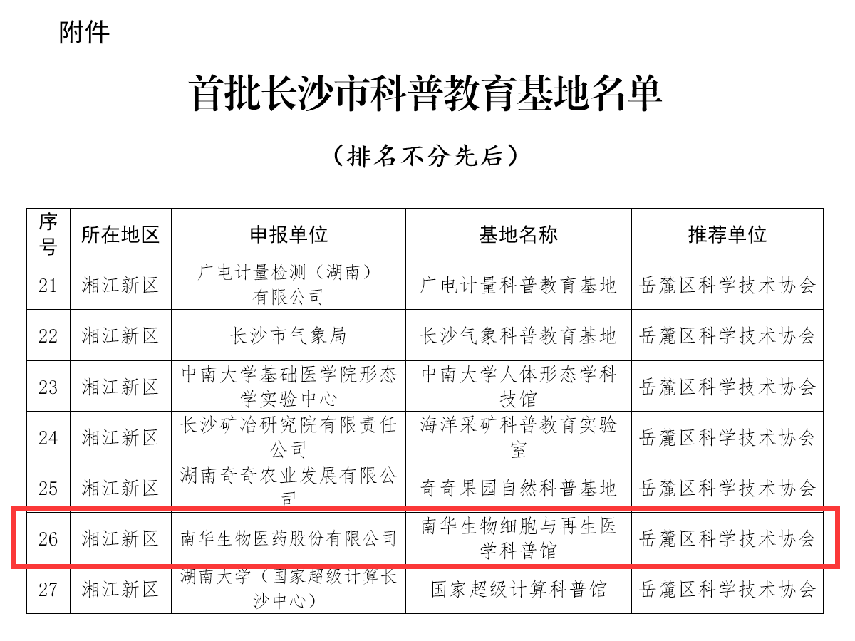 2024年2月1日,長沙市科學(xué)技術(shù)協(xié)會(huì)發(fā)布《關(guān)于認(rèn)定首批長沙市科普教育基地的通知》,南華生物細(xì)胞與再生醫(yī)學(xué)科普館獲評(píng)長沙市首批科普教育基地。